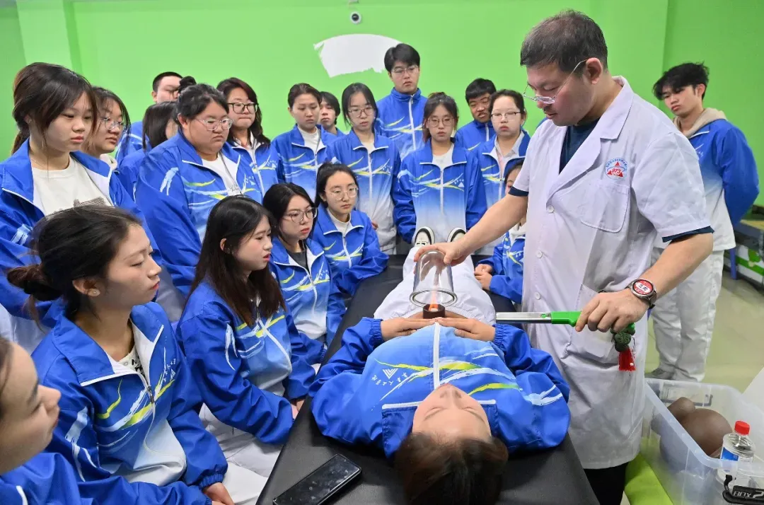 2025年12月,在长春人文学院,老年康复适宜技术的老师在指导学生们拔火罐。
