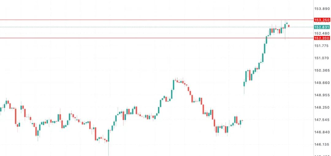 周四交易时段,美元兑日元扩大涨幅。日内最低测试152.10水平,截止收市最高触及153.23水平。