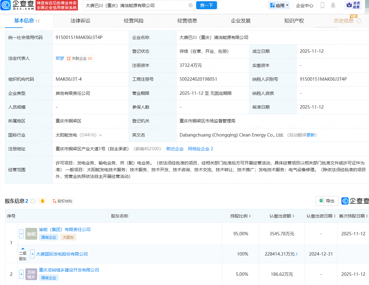 近日配资服务,大唐巴川(重庆)清洁能源有限公司成立,法定代表人为郑梦,注册资本为3732.4万元,经营范围包含:发电业务、输电业务、供(配)电业务;太阳能发电技术服务;发电技术服务等。企查查股权穿透显示,该公司由大唐发电(601991)全资子公司渝能(集团)有限责任公司、重庆龙裕城乡建设开发有限公司共同持股。