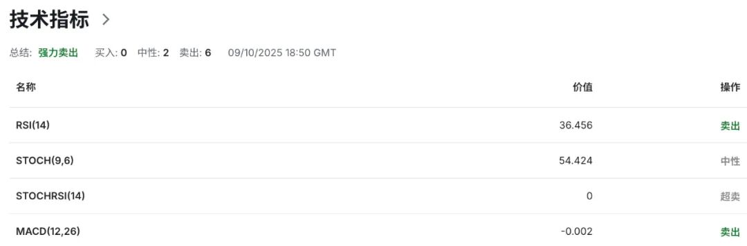动量指标方面,14日相对强弱指标(RSI)进一步下滑至36的弱势区间,表明当前空头动能依然占据明显优势。值得注意的是,该指标尚未触及30超卖界限,这为汇价后续继续下行预留了技术空间。